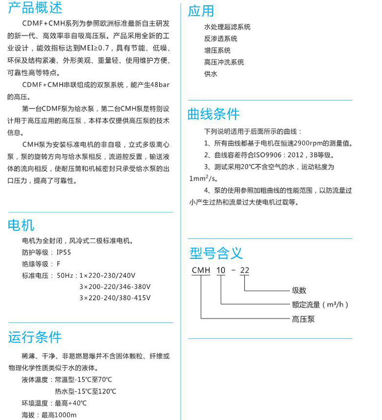 CDMF+CMH系列為參照歐洲標(biāo)準(zhǔn)自主研發(fā)的新一代、高效率非自吸高壓泵。產(chǎn)品采用全新的工業(yè)設(shè)計,能效指標(biāo)達(dá)到MEI≥0.7,具有節(jié)能、低噪、環(huán)保及結(jié)構(gòu)緊湊、外形美觀、重量輕、使用維護(hù)方便、可靠性高等特點。